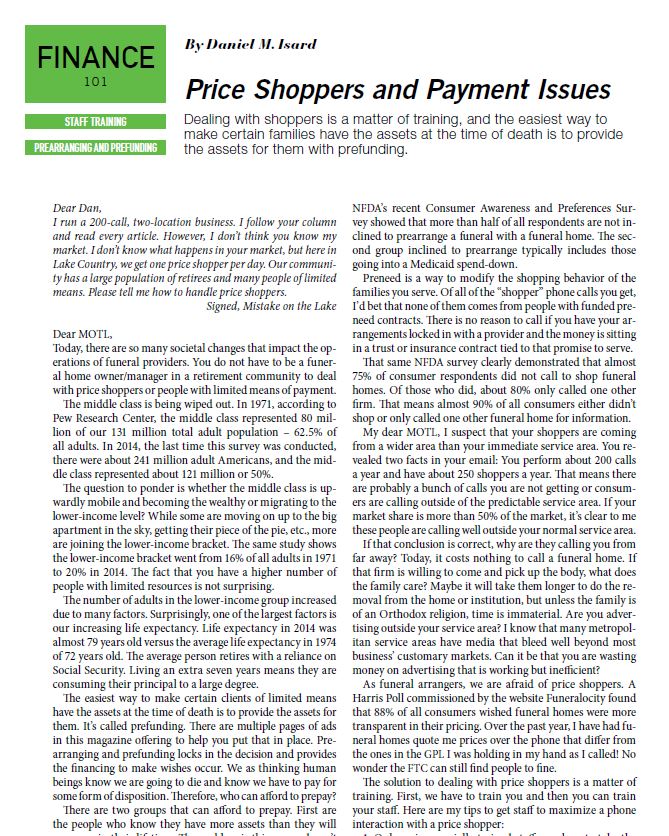 Price Shoppers and Payment Issues Dealing with shoppers is a matter of training, and the easiest way to make certain families have the assets at the time of death is to provide the assets for them with prefunding. Dear Dan, I run a 200-call, two-location business. I follow your column and read every article. However, I don’t think you know my market. I don’t know what happens in your market, but here in Lake Country, we get one price shopper per day. Our community has a large population of retirees and many people of limited means. Please tell me how to handle price shoppers. Signed, Mistake on the Lake Dear MOTL, Today, there are so many societal changes that impact the operations of funeral providers. You do not have to be a funeral home owner/manager in a retirement community […]